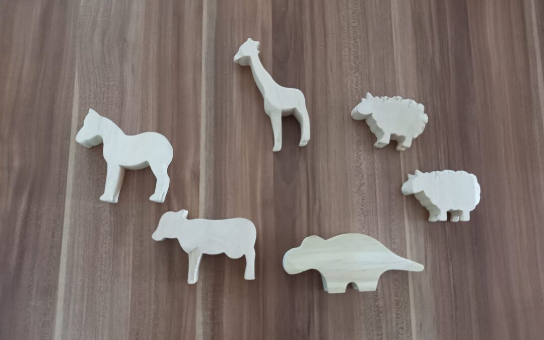 Im Werkunterricht in der Schule war die Arbeit an Hölzern ein ausführliches Thema. So entstand, unterstützt durch den Kunstlehrer, mein etwas seltsam aussehendes Holzmännchen und das kleine Xylofon, dem man tatsächlich einige Klänge entlocken konnte. Viele Jahre später (ich arbeitete bereits seit drei Jahren im Bereich des New Age), bekam ich das christliche Buch, „Spuren im Schnee“, von Patricia Saint John als Hörbuch geschenkt. Die Beschreibungen, die in diesem Buch von aus Holz geschnitzten Tieren stehen, hatten es mir angetan. Wobei die Geschichte von weit mehr, als von aus Holz geschnitzten Tieren handelt. Trotzdem sind sie ein wichtiger Teil der Geschichte. Nachdem ich vor 12 Jahren mehrfach das ganze Buch angehört hatte, dauerte es dann noch fünf Jahre, bis ich selbst mit dem Schnitzen anfing. Es ist für mich etwas Besonderes, morgens beim Gesang der Vögel und dem Rufen von Tauben im Gebet zu schnitzen (im Winter in einer dicken Friedenstauben-Atelier-Jacke). Oft habe ich das Gefühl, ich bekomme himmlische Anleitungen. So entstand während eines Gebets einmal ein sehr besonders aussehendes Schaf. Ausschließlich mit einem Schnitzmesser, mit dem ich an der vorgefrästen Figur aus einem Spielwarengeschäft schnitzte. Ein anderes Mal brach mir an einer Giraffe aus einem Lindenholz-Zootier-Schnitt-Set ein Bein ab. Dennoch konnte ich sie so weiter bearbeiten, dass es möglich war, sie inmitten der anderen Zoo- und Bauernhof-Tiere hinzustellen und am Ende alle gemeinsam zu verschenken. Auf dieser Website stelle ich zusätzlich zu gestrickten Bildern, Stoffcollagen, gemalten Bildern auf verschiedenen Malgründen und Lego® Baumwollstrick-Lego®-Collagen, Fotos meiner geschnitzten Werke aus. Unter „Angebot“ finden Sie verschiedenste Angebote für sich selbst sowie auf meiner Tiergesprächsseite Angebote für Ihre Tiere. Hier stelle ich in unregelmäßigen Abständen Fotos ein, da meine größte Aufmerksamkeit auf den Gesprächen mit Tieren, meiner künstlerischen Arbeit mit Wolle, Stoffen, der Malerei sowie meiner Kunst mit Lego® liegt. Die Holzschnitzerei ist mein Hobby, wenn ich Eingebungen dazu bekomme, arbeite ich in meinem Friedens-Tauben-Atelier auch mit Specksteinen und lufttrocknendem Soft-Ton. Jedoch gilt meine größte Aufmerksamkeit in meiner Freizeit natürlich dem Stricken, der Malerei, Collagen sowie der Hobbyschnitzerei (auch mein Tag hat ja nur 24 Stunden). Meine Arbeit in meinem Friedens-Tauben-Atelier (insbesondere die Holzschnitzerei), ist ein besonderer Teil meiner Gebete und Meditationen. Im Alten Testament, im zweiten Buch Mose, ist viel über unterschiedlichstes Kunsthandwerk zu finden. Manchmal lese ich dort nach, wenn ich auf der Suche nach einer neuen Idee bin. (Foto verschiedener geschnitzter Tiere).